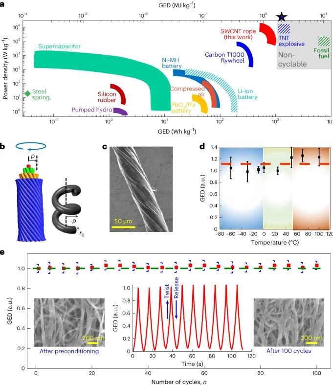 CNTs因其卓越的机械性能和轻质特性而著名,尤其是SWCNT在机械能存储方面显示出巨大潜力,理论上能存储高达8兆焦耳/千克的能量。与传统碳纤维不同,扭曲的SWCNT绳通过独特机制实现能量存储,其性能在极宽温度范围内保持稳定,展现了非凡的性能。